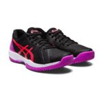 Asics Solution Swift FF Padel Femme Noir-Rose — le modèle qu'Asics a développé spécifiquement pour le padel avec l'amorti FlyteFoam, pas une simple adaptation du tennis.