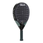 Format rond, cadre carbone C24K, noyau Eva, point d'équilibre bas, surface rugueuse. Le C24K — le tissage le plus fin de la gamme Siux — apporte de la rigidité et de la précision dans les faces. Le format rond avec équilibre bas est la configuration classique du contrôle maximal, mais la surface rugueuse ajoute une dimension inattendue : la capacité à générer de l'effet (64) malgré un profil défensif.